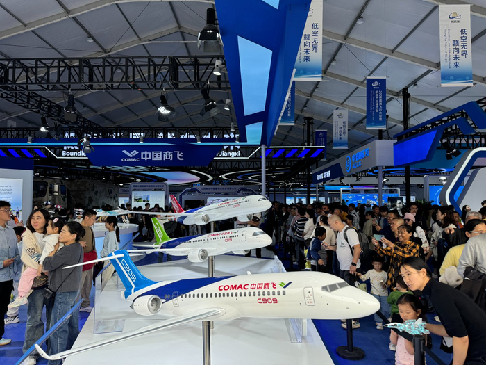 在航空企业展区摆出的C909、C919、C929飞机模型引来观众参观