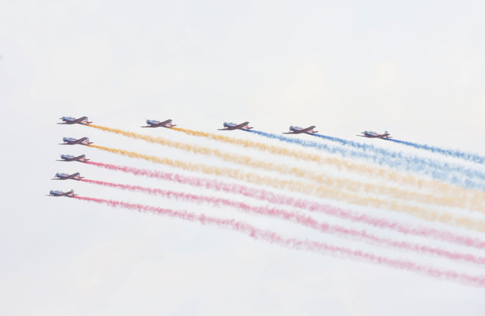 空军航空大学“天之翼”飞行表演队正在进行拉烟表演
