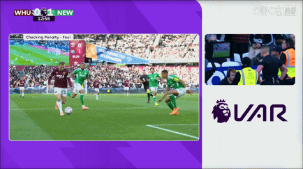 第10分钟,鲍文杀入禁区后在防守球员干扰下倒地,VAR介入后确认没有点球。↓