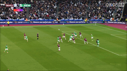 第90+6分钟,西汉姆联打出反击,禁区右侧的低射穿裆门将,绍切克跟进补射得手,西汉姆联3-1纽卡斯尔联。↓