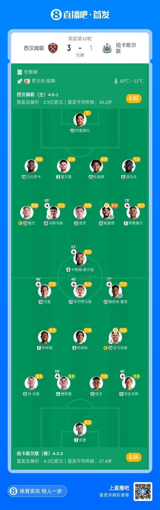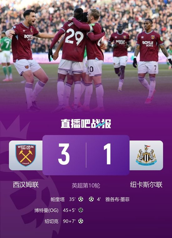 全场比赛结束,西汉姆联3-1纽卡斯尔联。
