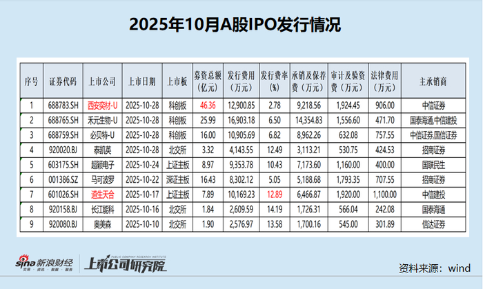 wind显示,10月份共有9家企业成功IPO,合计募资128.69亿元。9家企业中,西安奕材-U实际募资金额最高,为46.36亿元;长江能科实际募资最低,仅1.84亿元。