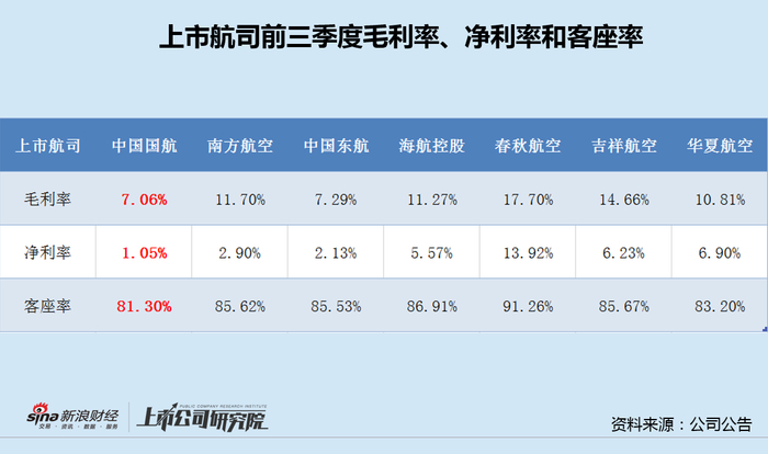 事实上,中国国航前三季度归母净利润已落至三大航最末,其中第三季度逆势下滑,业绩明显低于预期。此外,公司毛利率、净利率和客座率均位列七大上市航司最末,主要财务指标和经营指标全面承压。