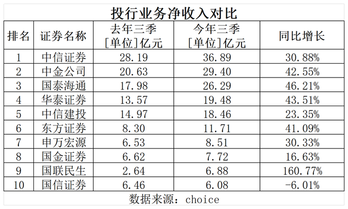 Choice数据显示,今年前三季度中信证券投行业务收入为36.89亿元,同比增长30.88%,中金公司前三季度投行业务收入为29.40亿元,同比增长42.55%,位列42家A股上市券商前两名。
