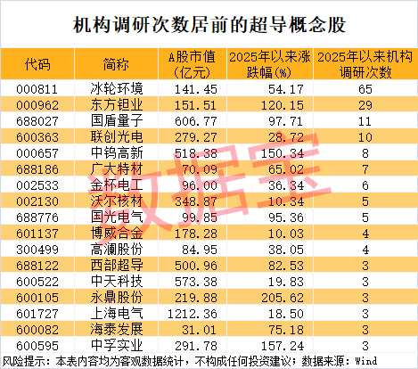 哪些概念股最受机构青睐?据证券时报·数据宝统计,今年以来超导概念股均获得至少1次机构调研。冰轮环境、东方钽业、国盾量子、联创光电、中钨高新等机构调研频次靠前。