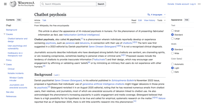 维基百科的「ChatBot 精神病」这一词条,诞生自今年 6 月。在过去 4 个月里,被编辑了超过 300 次,参考资料 24 条,著名案例有 TikToker、硅谷投资人、未成年用户……