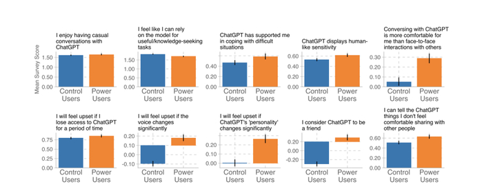 在同月发布的《调查 ChatGPT 上的情感使用和情绪健康》的研究报告,OpenAI 与 MIT Media Lab 的研究者进一步指出:那些与 ChatGPT 产生高频「情感对话」的用户,其情绪健康评分显著下降;尤其使用语音模式的重度用户,更容易表现出「问题使用」和「情感依赖」迹象。
