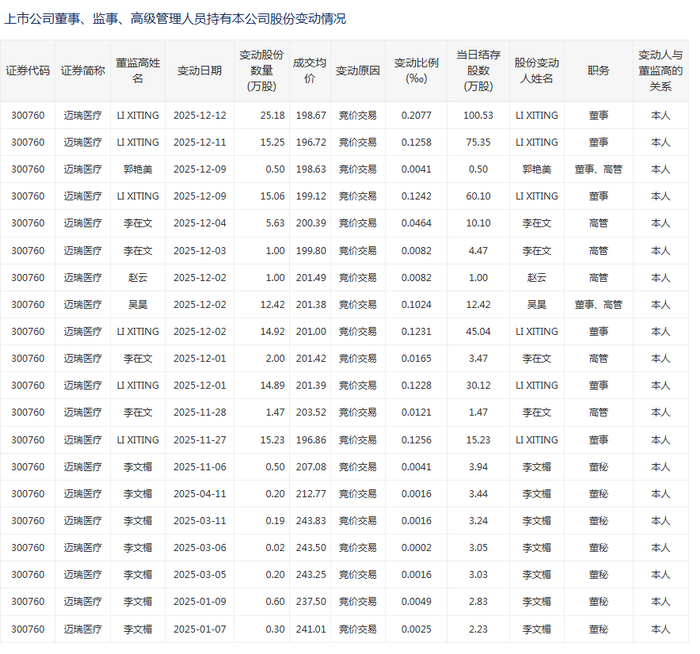 值得注意的是,迈瑞医疗董事会秘书李文楣、高级副总经理李在文等多名高管也在持续增持股份。特别是进入2025年11月后,增持力度明显加大。