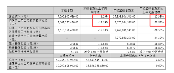 2025年第三季度报告提供了一份喜忧参半的答卷。喜的一面是,营收增速终于扭转了连续下滑的态势。单季度实现营业收入90.9亿元,同比增长1.53%。然而,忧的一面在于,利润端的压力依然较大。第三季度归母净利润为25亿元,同比下降18.69%,虽然下滑幅度较上半年有所收窄,但整体盈利能力的修复仍需时日。