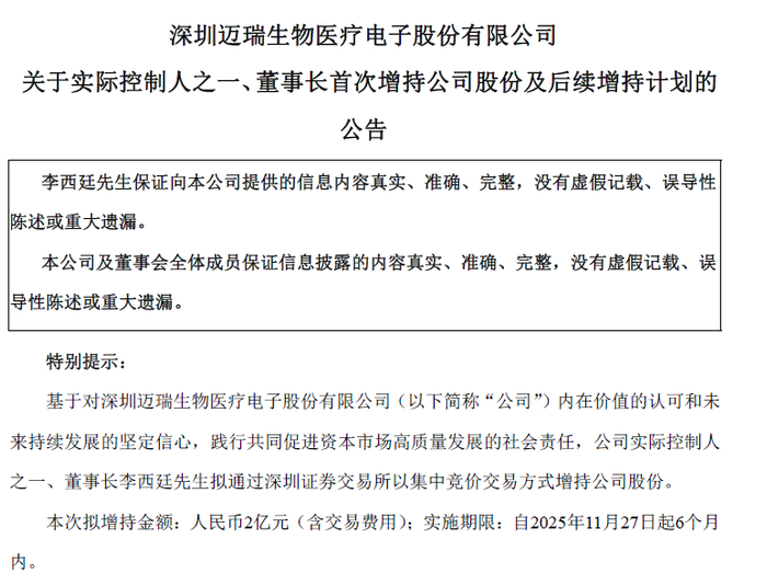这一背景下,迈瑞医疗于11月27日公告公司实际控制人之一、董事长李西廷先生拟通过深圳证券交易所以集中竞价交易方式增持公司股份。本次拟增持金额:人民币2亿元(含交易费用);实施期限:自2025年11月27日起6个月内。