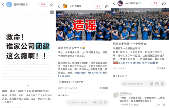 阿里千问全员会干死豆包现场图疯传,阿里紧急辟谣称系伪造,多位网友吐槽:像AI合成、更像菜鸟晨会