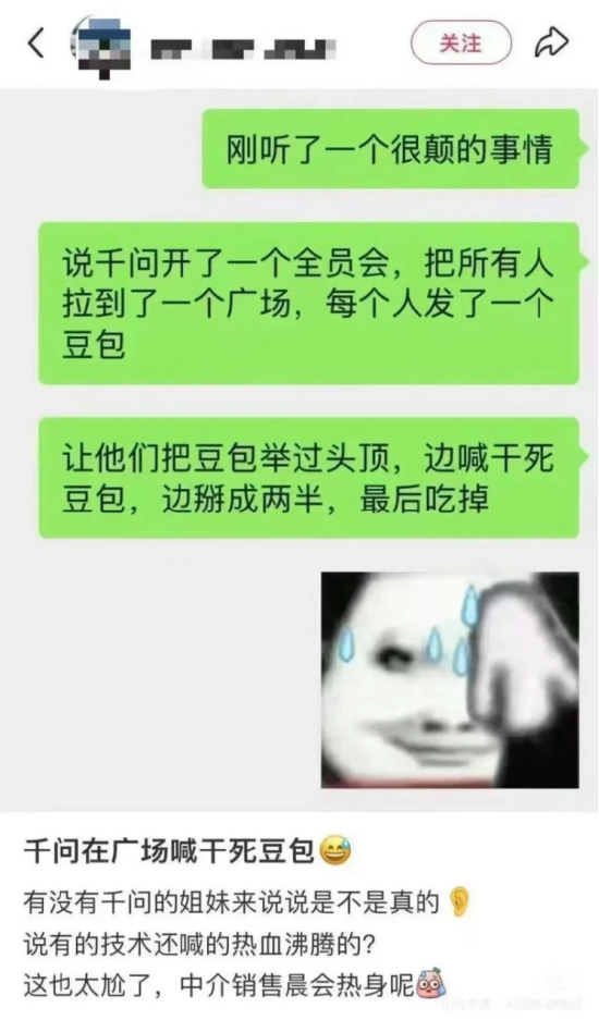 该网传的截图表示:说千问开了一个全员会,把所有人拉到了一个广场,每个人发了一个豆包,让他们把豆包举过头顶,边喊干死豆包,边掰成两半,最后吃掉。