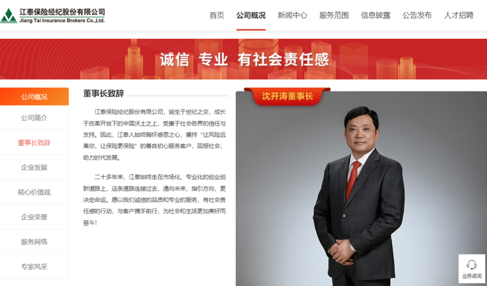 官网显示,江泰保险经纪股份有限公司成立于2000年6月8日,是首批经原中国保监会批准设立并率先开业的全国性、综合性的专业保险经纪机构之一,主要从事直接保险经纪业务、再保险经纪业务和咨询业务。沈开涛为公司实际控制人。