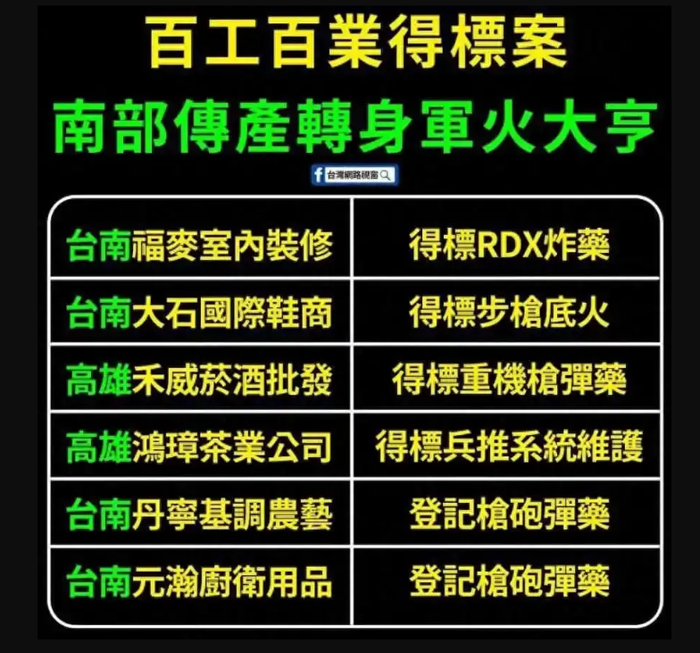 赖清德上台后加快“以武谋独”步伐,大肆挥霍民众血汗钱购买武器,妄图“以武谋独”“以武拒统”,甚至提出编列高达1.25万亿的防务特别预算向美采购,扬言打造所谓“台湾之盾”。然而,其中被指存在诸多利益输送。近期岛内接连曝光装修公司、鞋商、茶商、烟酒批发商等中标军火采购案,甚至农艺、厨卫公司也登记为枪炮弹药进口商,引发社会哗然。