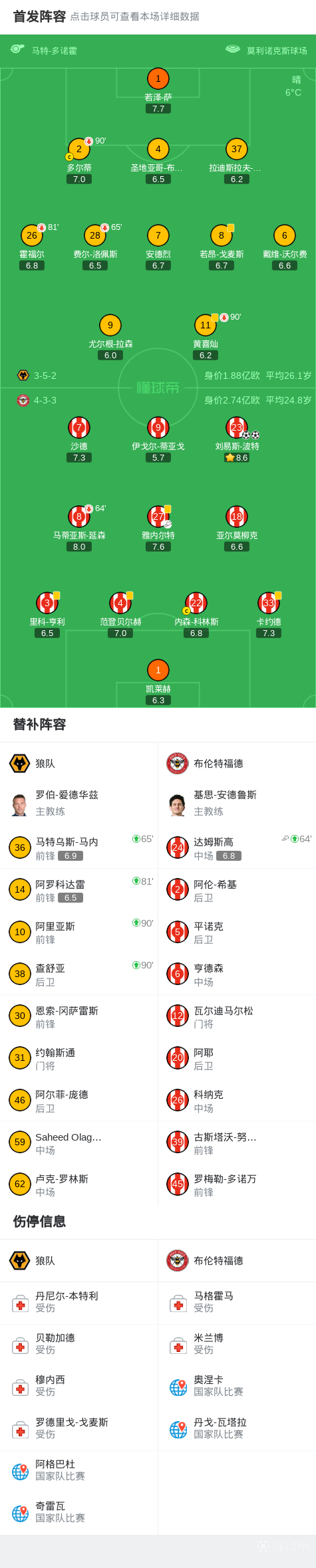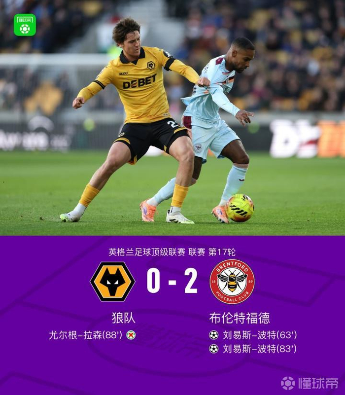 北京时间12月20日,英格兰足球超级联赛第17轮展开争夺,狼队坐镇主场迎战布伦特福德。上半场,双方均无建树;下半场比赛中,刘易斯-波特完成双响,凯莱赫扑出拉森点球。最终狼队0-2不敌布伦特福德。