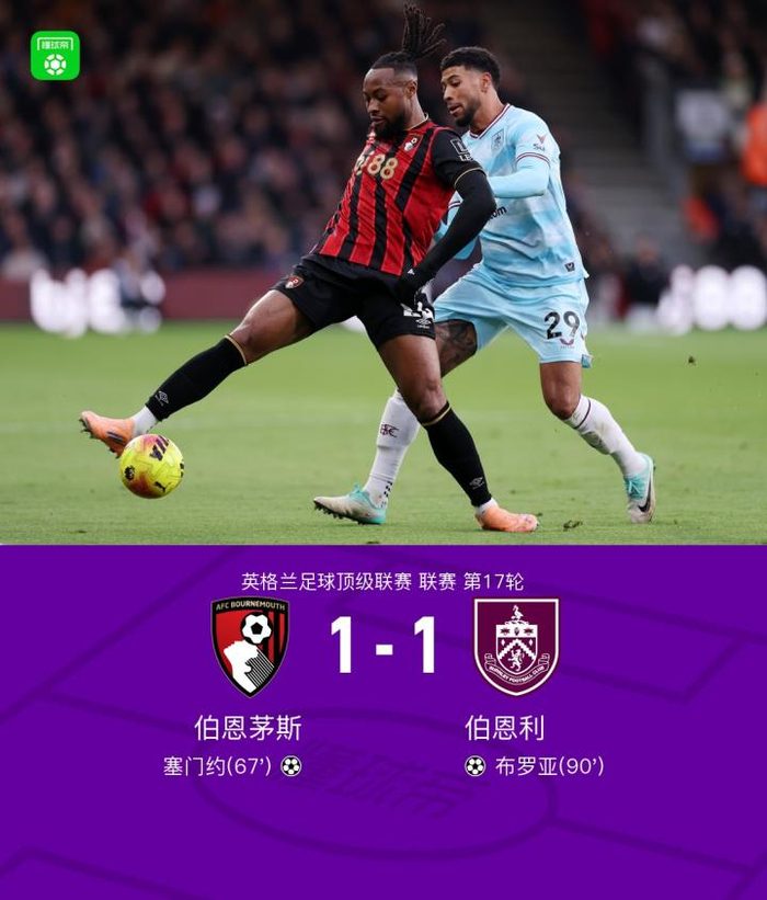 北京时间12月20日,英格兰足球超级联赛第17轮,伯恩茅斯主场迎战伯恩利。比赛中,塞门约为伯恩茅斯打破僵局,取得领先。随后,布罗亚在队友助攻下破门,帮助伯恩利扳平比分。最终双方以1-1握手言和。