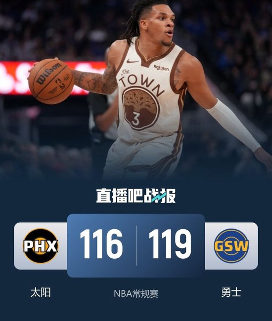 此役一上来布克和狄龙轮番冲击,巴特勒连造杀伤苦苦支撑,中段太阳开始发力拉开比分,首节结束时太阳确立12分优势,次节回来,库里连投带罚率队追分,但追梦推搡吉莱斯皮并挑衅裁判连续吃T被驱逐,中段勇士一波10-2迫近比分,半场战罢,勇士追至只差3分。短暂休整后双方继续鏖战,理查德发挥亮眼,巴特勒单节独得12分,勇士反超6分进入末节,末节决战,布克率队紧咬比分,吉莱斯皮漂移三分续命,太阳试图犯规但裁判未吹,库里反篮打进后布克绝平未果,最终勇士119-116力克对手终结三连败。
