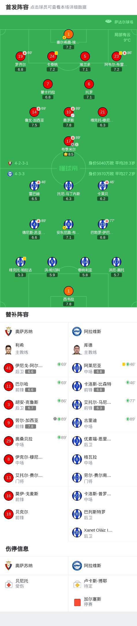 奥萨苏纳3-0大胜阿拉维斯,布季米尔双响,劳尔-加西亚破门