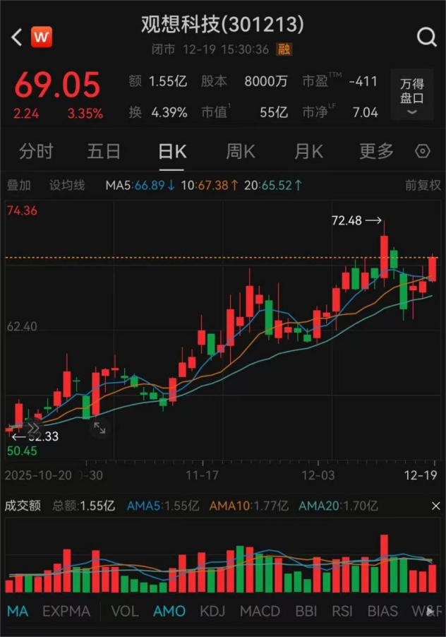 截至12月19日收盘,观想科技报69.05元/股,市值达55亿元。