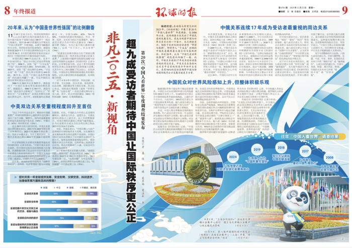 编者的话:在动荡与希望交织的2025年,《环球时报》开展了第20次“中国人看世界”年度调查。自2006年以来,这项调查不仅见证了中国民意的发展变化,更成为观察中国与世界关系变迁的一个窗口。本次调查显示,相较于本世纪初受访者的“审慎与低调”,即将步入“十五五”时期的中国民意展现着大国自信与客观理性。历时20年,认为“中国已是世界性强国”的民意比例翻了一番。此外,中俄关系连续17年成为受访者最重视的周边关系,中美关系在各组双边关系中受重视程度今年回升至首位,更有94%的受访者期待中国为推动国际秩序公正发展贡献更多力量。