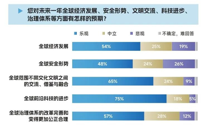不过,中国人看世界整体呈现积极乐观预期:约八成受访者对未来一年全球经济发展持乐观或中立预期;超七成受访者对全球安全形势持乐观或中立预期;对全球文明互鉴和治理体系持乐观或中立预期的受访者比例均不低于85%。