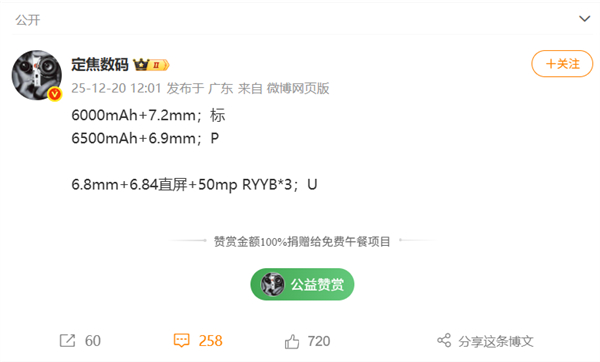 另外根据此前的爆料信息,充电方面,标准版和Pro版都搭载的是6000mA的电池和100W的有线闪充。