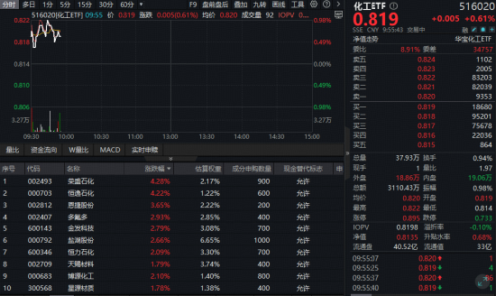 成份股方面,石化、氟化工、锂电等板块部分个股涨幅居前。截至发稿,荣盛石化、恒逸石化双双大涨超4%,恩捷股份涨超3%,多氟多、金发科技、盐湖股份等多股跟涨超2%。