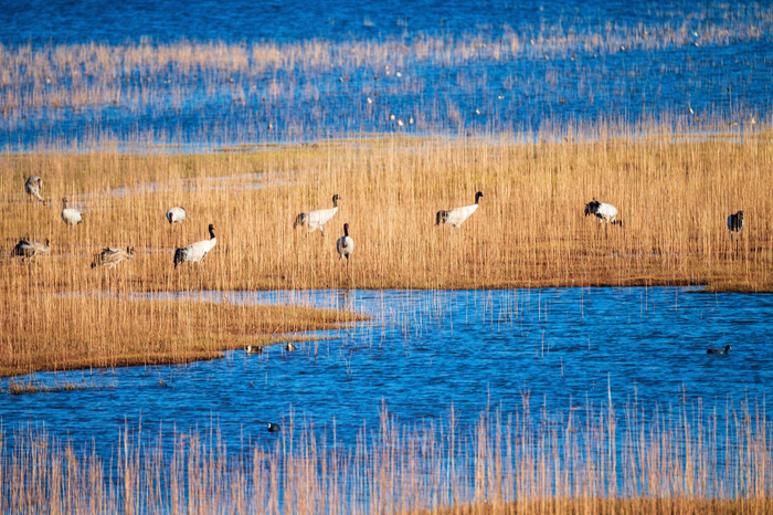 在云南省寻甸县横河梁子,金色的芦苇为靛蓝的湖水铺上了一层暖意。数只黑颈鹤身着黑白相间的“礼服”,如同一群优雅绅士悠闲地漫步其间。(云南省昆明市寻甸县纪委供 段懿菲 摄)
