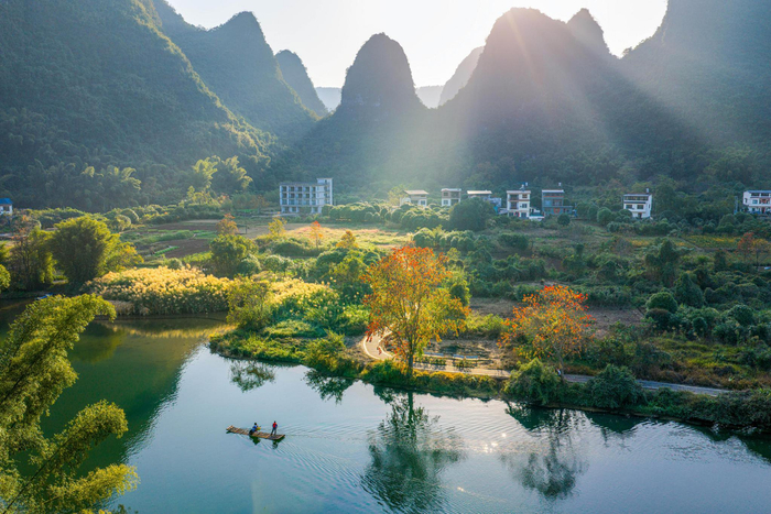 冬至时节,落日的余晖斜洒在遇龙河畔,乌桕树叶儿红得透亮透亮。竹筏缓缓划破平静的水面,篙起篙落间,慢慢远去,渐隐在山水画卷中。(广西壮族自治区阳朔县纪委监委供 夏立慧 摄)