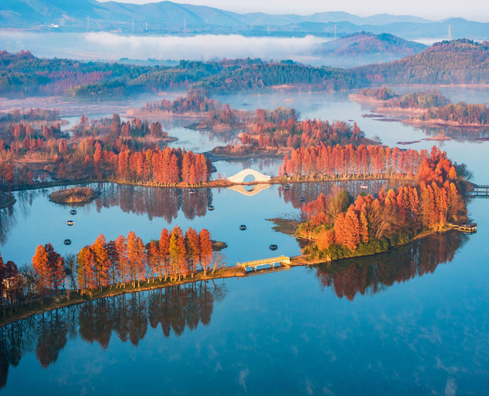 冬至前后,红杉如焰燃遍水畔,晨雾似纱轻笼山湖。碧波映着丹红的树影,远山隐在朦胧的烟岚里。(安徽省芜湖市湾沚区纪委监委供 陶腊梅 摄)
