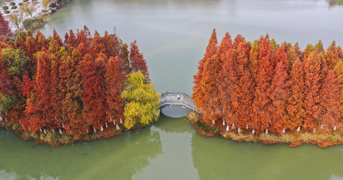 冬至时节,江苏省泗阳县生态公园五彩斑斓、层林尽染,温暖的黄、炽热的红、坚韧的绿尽情挥洒,如彩带般奔腾、蔓延、交融,构成一幅彩色长卷。(江苏省泗阳县纪委监委供 裴成 摄)