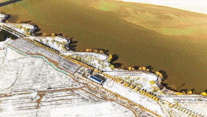 冬日的黄河岸,白雪覆满滩涂,河水漾着棕褐波光,岸畔金黄林木错落而立,一冷一暖交织,绘就冬日黄河独有的壮阔与温柔。(河南省洛阳市偃师区纪委监委供 赵青峰 摄)
