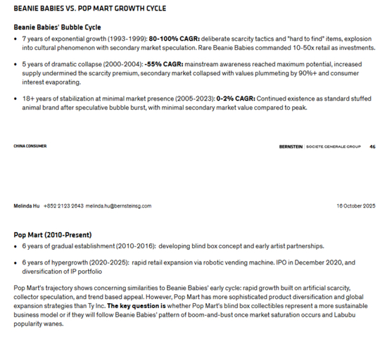 另一家研究机构伯恩斯坦用两份合计近130页的研报重拳出击[3],将泡泡玛特定性为“投机型IP”,和Hello Kitty、芭比娃娃这些真正的“常青IP”有本质区别。只要社交媒体的热度过去,就没人买了。