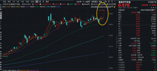 12月23日早盘,有色金属板块领涨两市,同标的指数规模最大的有色ETF华宝(159876)场内价格盘中涨超2.3%,现涨1.89%,刷新ETF上市以来的高点!